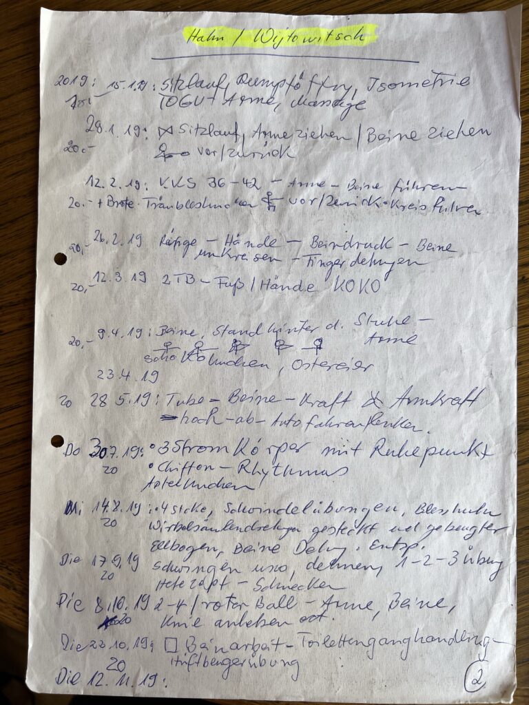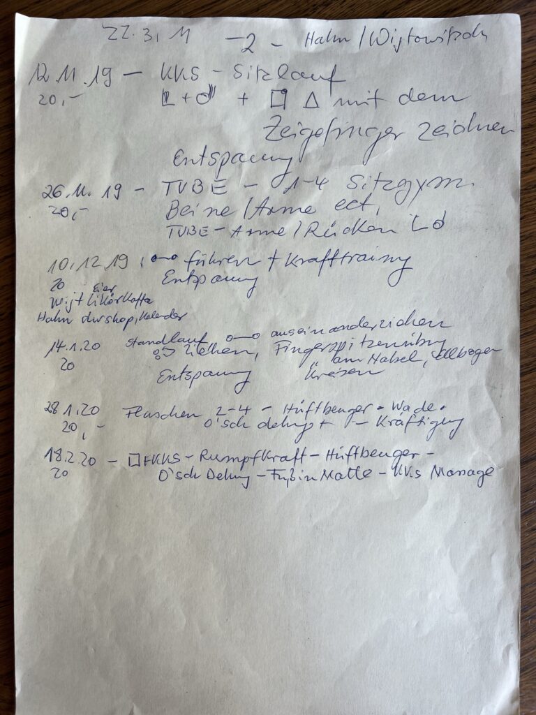 Seit ein paar Tagen räumen wir, Frank, Karin und ich, im Haus von Gerda. Dabei habe wir Unterlagen von ihren Gymnastik-Gruppen gefunden. Sie hat jede Stunde dokumentiert.