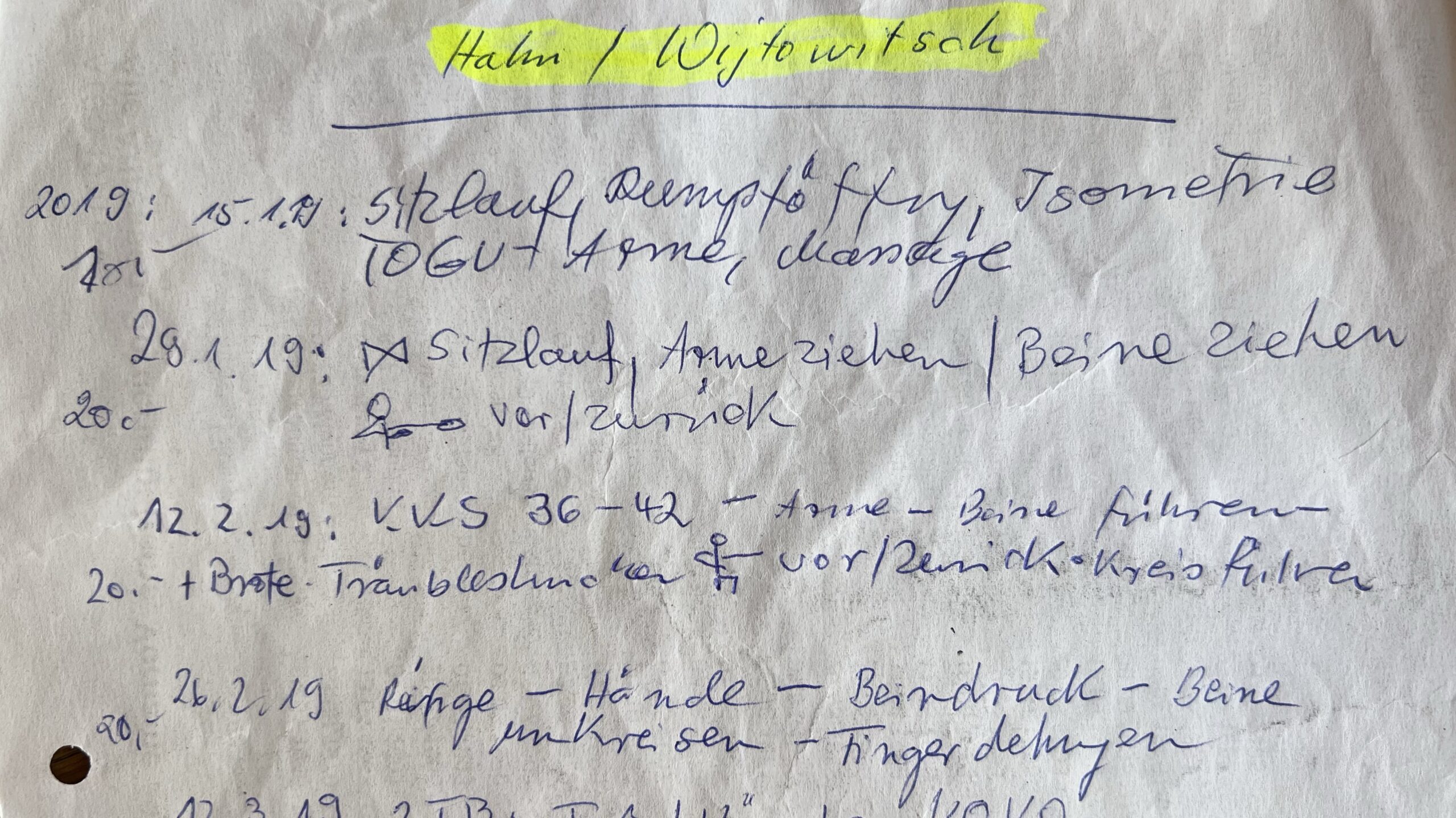 Seit ein paar Tagen räumen wir, Frank, Karin und ich, im Haus von Gerda. Dabei habe wir Unterlagen von ihren Gymnastik-Gruppen gefunden. Sie hat jede Stunde dokumentiert.