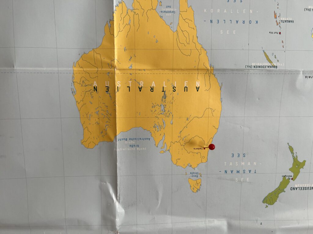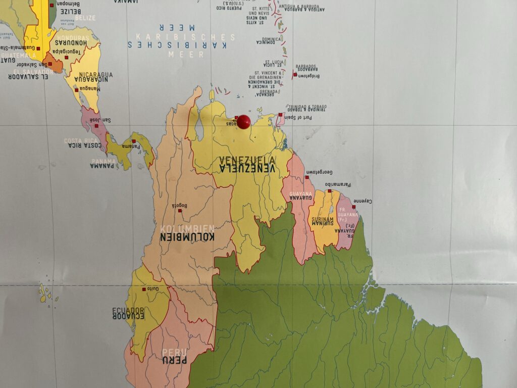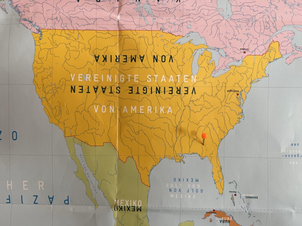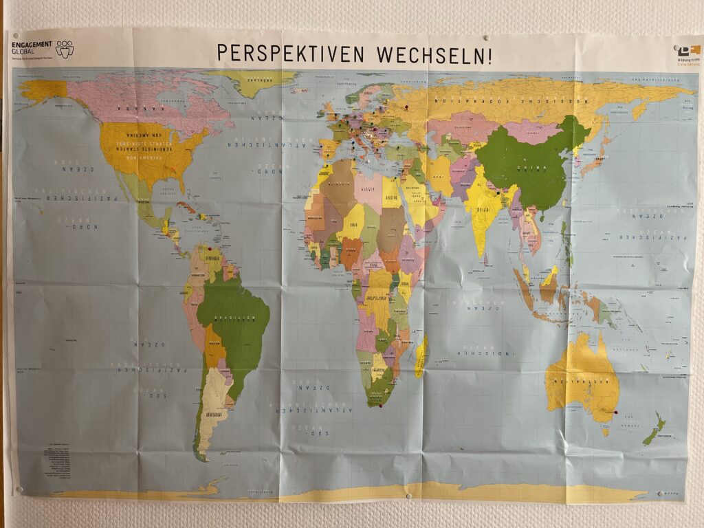 Hinter der Tür hat Gerda auf einer Weltkarte Nadeln eingesteckt um zu markieren, wo sie schon überall war.