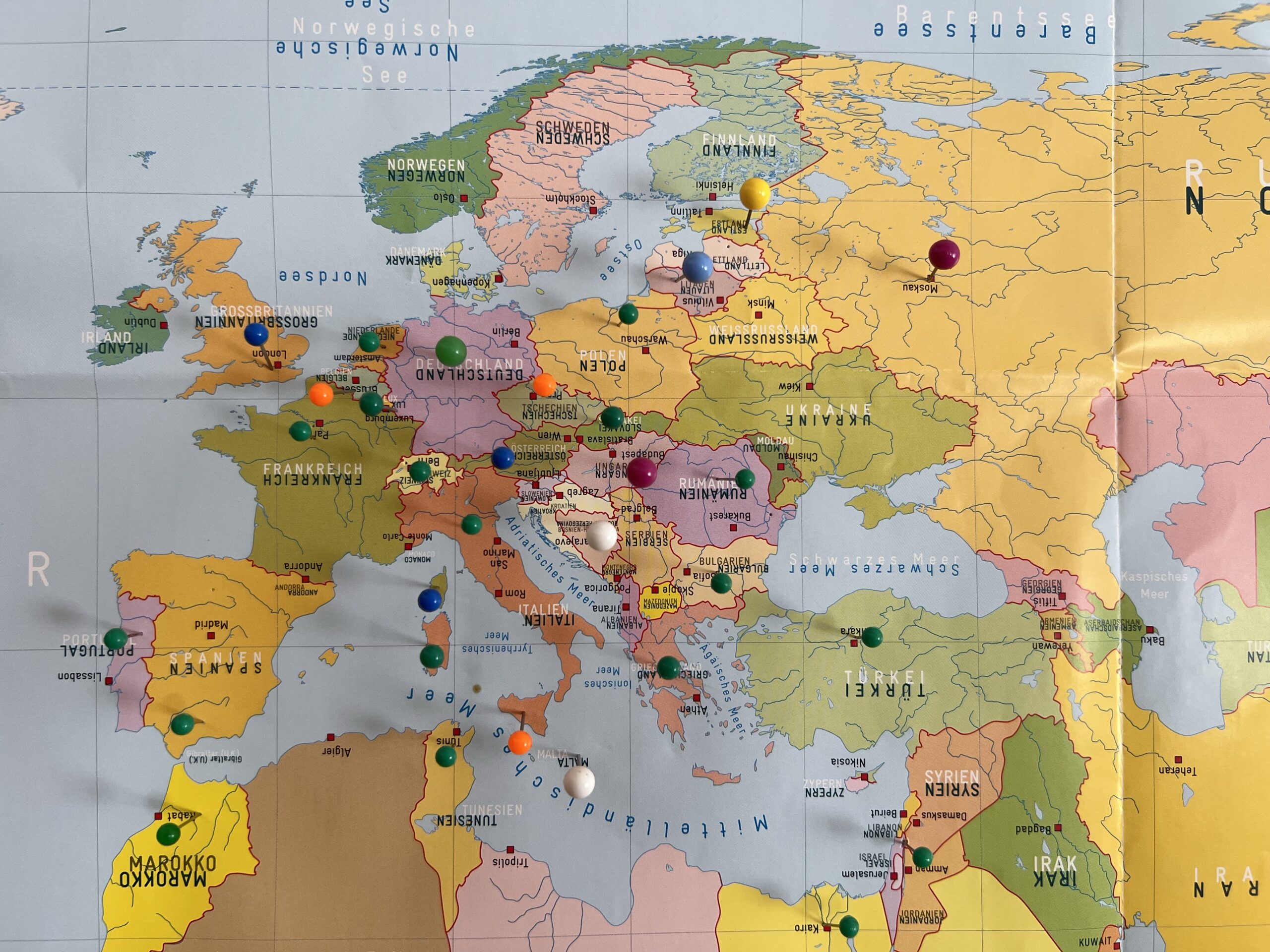 Hinter der Tür hat Gerda auf einer Weltkarte Nadeln eingesteckt um zu markieren, wo sie schon überall war.