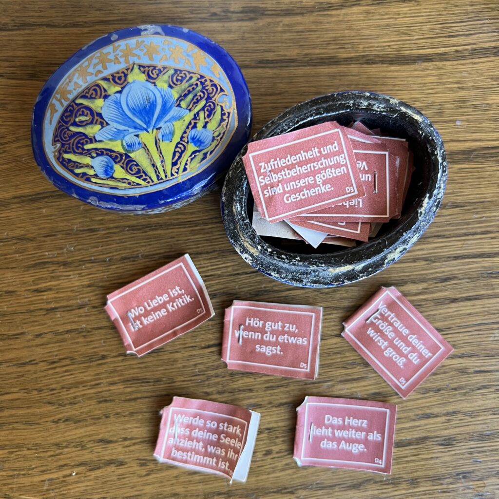 Frank und ich haben eine Woche lang in Gerdas Haus die Unterlagen durchgesehen und den größten Teil ausgemistet. Das war auch eine Zeitreise in unsere Kindheit und darüber hinaus. Und sind viele Einblicke in das Leben unserer Eltern möglich geworden, Aspekte, die wir noch nicht kannten. Und vieles was wir neu erinnert haben. Schrebergarten in Seligenstadt, Töpferkurse in Bruchköbel, Bewerbung zu einem Hochschulstudium der Soziologie und die vielen Ausbildungen in Gesundheitssport sind nur einige Stationen. Mama war alles, nur nicht langweilig. Und zwischendrin begegneten uns immer wieder Zettel auf denen sie einen Spruch geschrieben hatte, als würde sie kurz zu uns rüber grüßen.