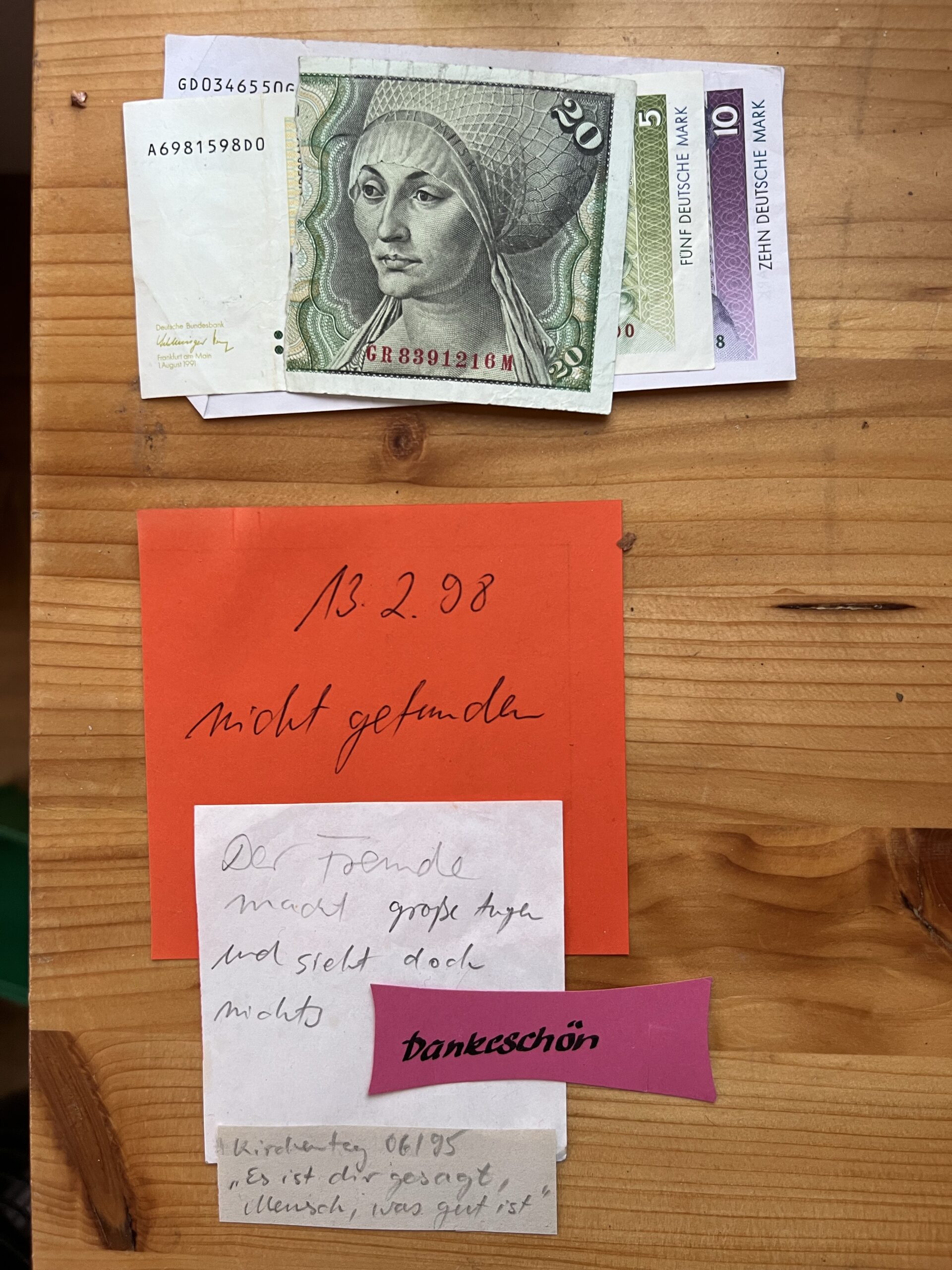 Frank und ich haben eine Woche lang in Gerdas Haus die Unterlagen durchgesehen und den größten Teil ausgemistet. Das war auch eine Zeitreise in unsere Kindheit und darüber hinaus. Und sind viele Einblicke in das Leben unserer Eltern möglich geworden, Aspekte, die wir noch nicht kannten. Und vieles was wir neu erinnert haben. Schrebergarten in Seligenstadt, Töpferkurse in Bruchköbel, Bewerbung zu einem Hochschulstudium der Soziologie und die vielen Ausbildungen in Gesundheitssport sind nur einige Stationen. Mama war alles, nur nicht langweilig. Und zwischendrin begegneten uns immer wieder Zettel auf denen sie einen Spruch geschrieben hatte, als würde sie kurz zu uns rüber grüßen.